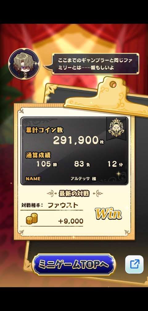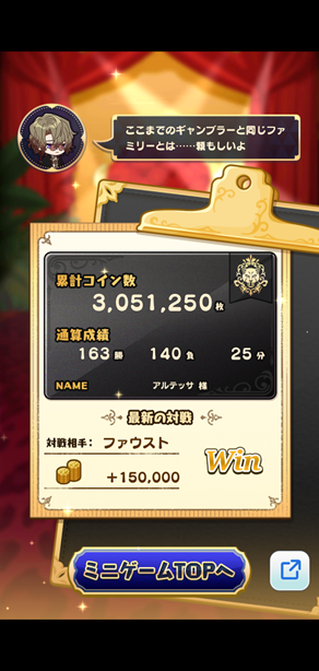 ファウストとのゲームで9,000枚獲得しました
